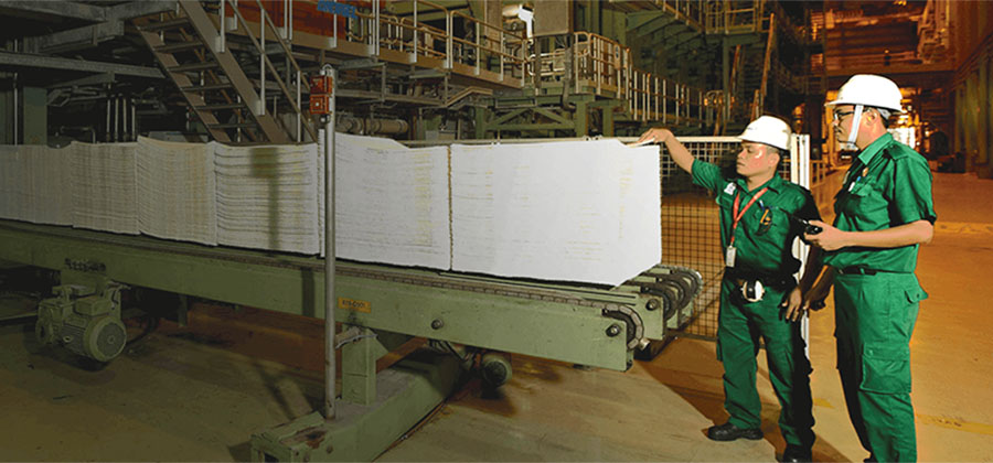Moving at almost 90 kilometres an hour, the thin mats are fed into the press section, where up to 50% of the water content is squeezed out, up to 90% of water in this entire manufacturing process is also recycled.